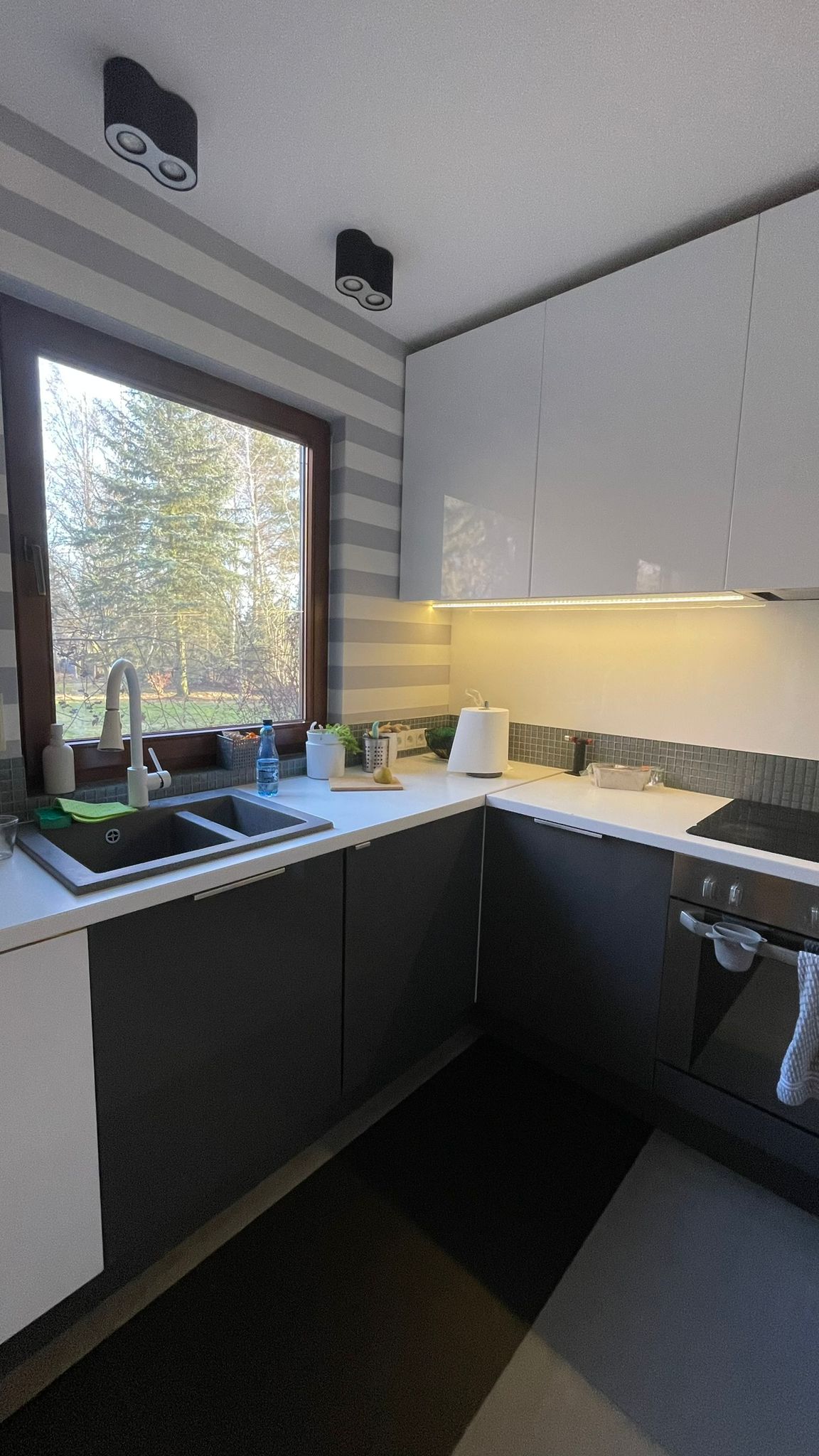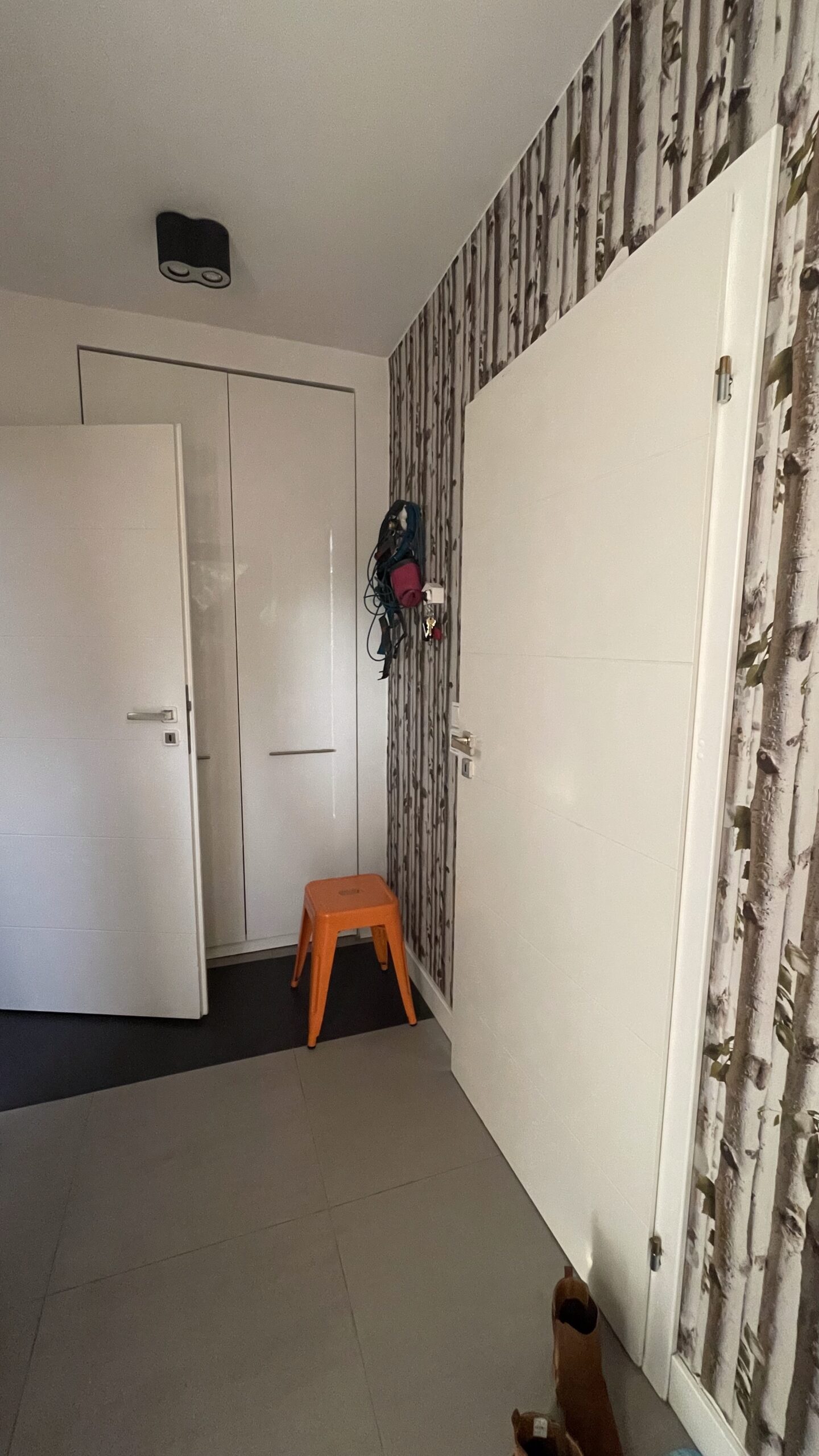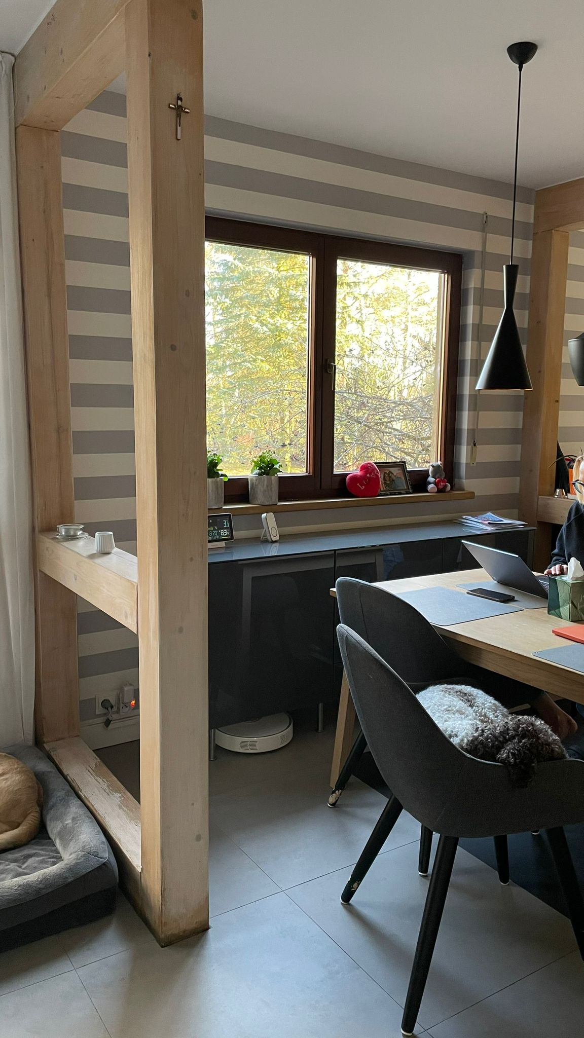 W holu głównie przebywają psiaki i chętnie otrzepują się tam po kąpieli czy spacerze, dlatego zdecydowaliśmy się na drugą wersję holu – ciemniejszy kolor farb i tapetę łatwozmywalną. By codzienność była łatwiejsza 😉