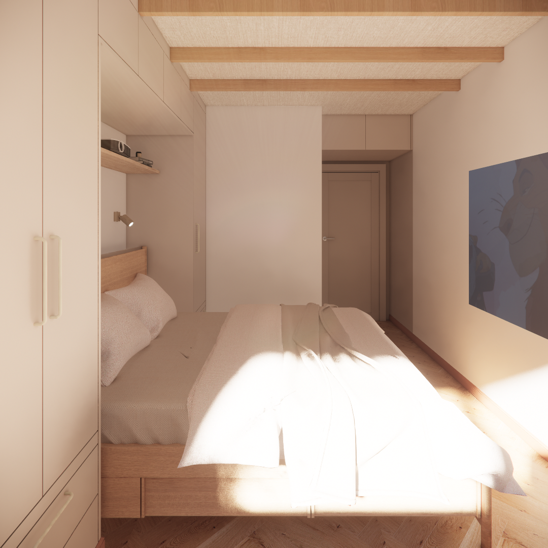 3. Po trzecie – rozrywka. Zamiast wieszać telewizor, w sypialni pojawił się rzutnik. To idealne rozwiązanie, które od czasu do czasu (nie codziennie!) pozwala zamienić pokój w prywatną salę kinową.